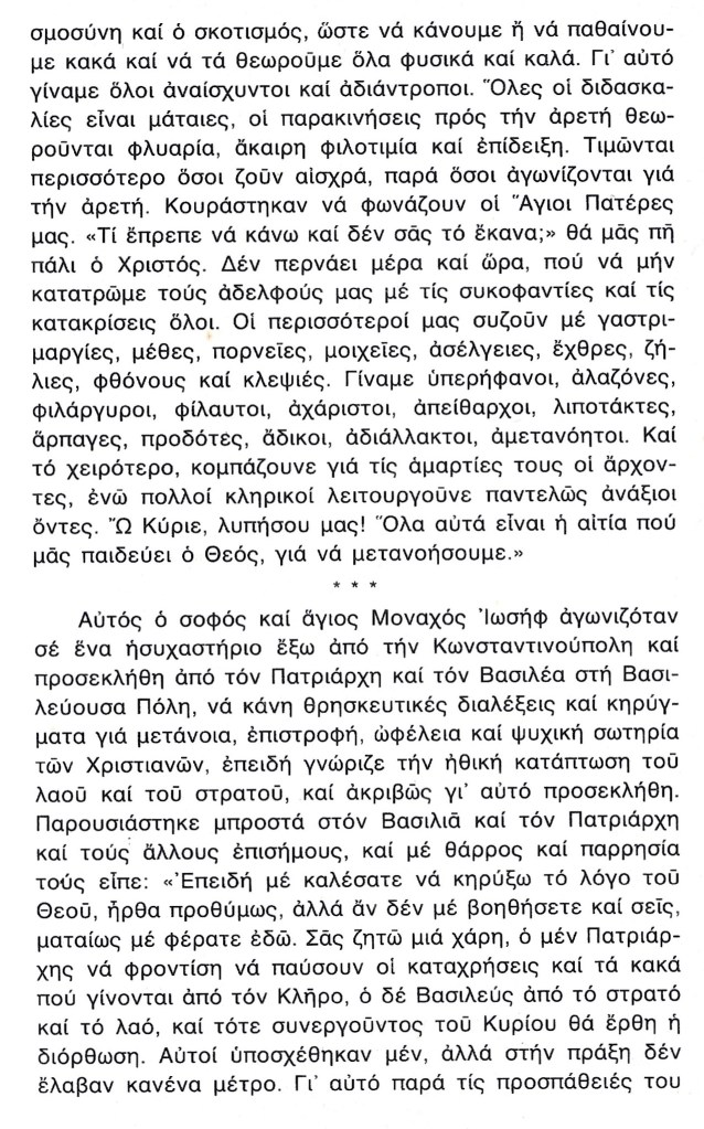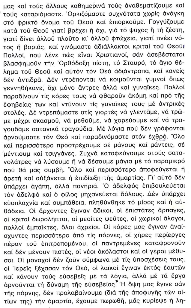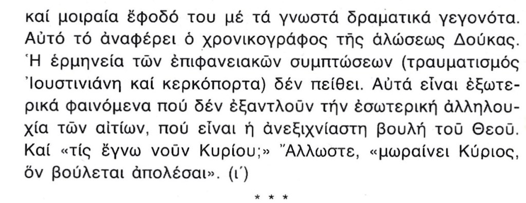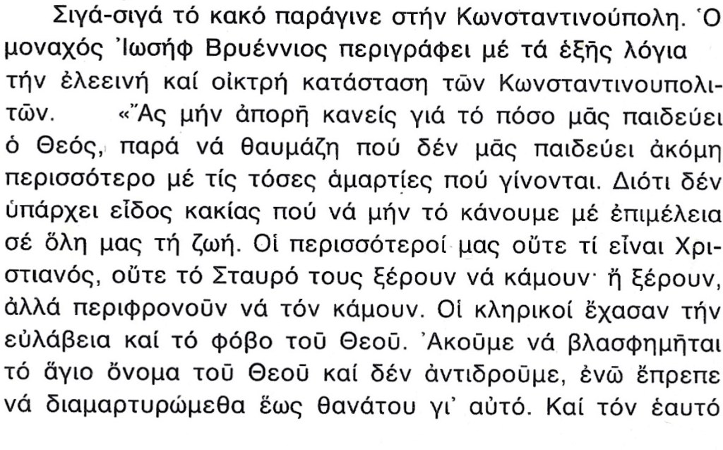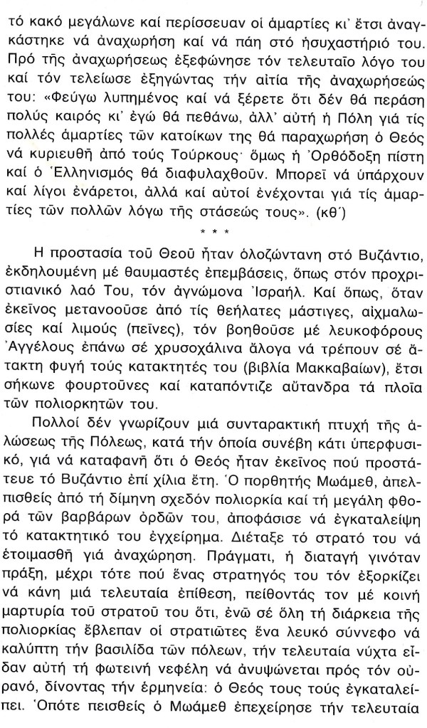 Όμως πρέπει να ξανατονισθή ότι όσο αμάρταναν οι άνθρωποι συμμέτρως, η Κωνσταντινούπολη προστατευόταν από την Θεοτόκο και φυλαγόταν από κάθε άλωση. Αλλά, όταν γλυστρίσαμε υπερβαλλόντως στην κακία και στην αμετανοησία, τότε η Πόλη στερήθηκε την προστασία της Θεοτόκου και παραδόθηκε στα χέρια των αθέων αλλοφύλων. Και τώρα βρίσκεται ακλεής και άτιμος η πρότερον ευκλεής και έντιμος, ώστε ο καθένας που την βλέπει να αναστενάζη από τα βάθη της καρδιάς του.