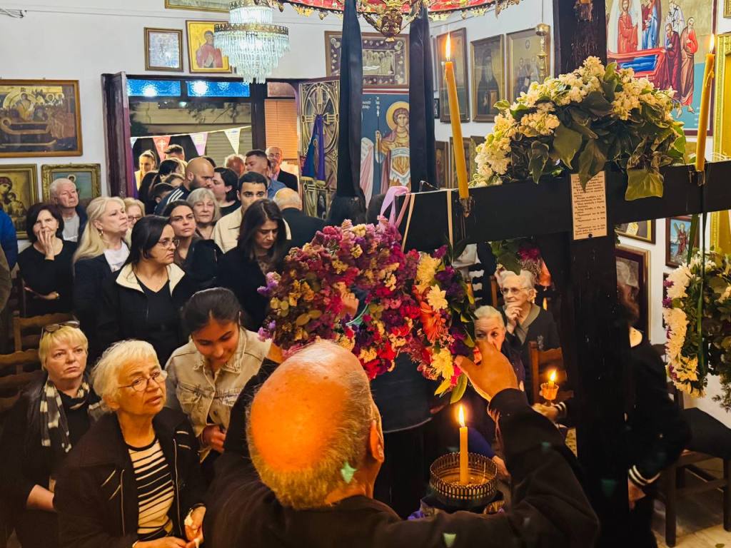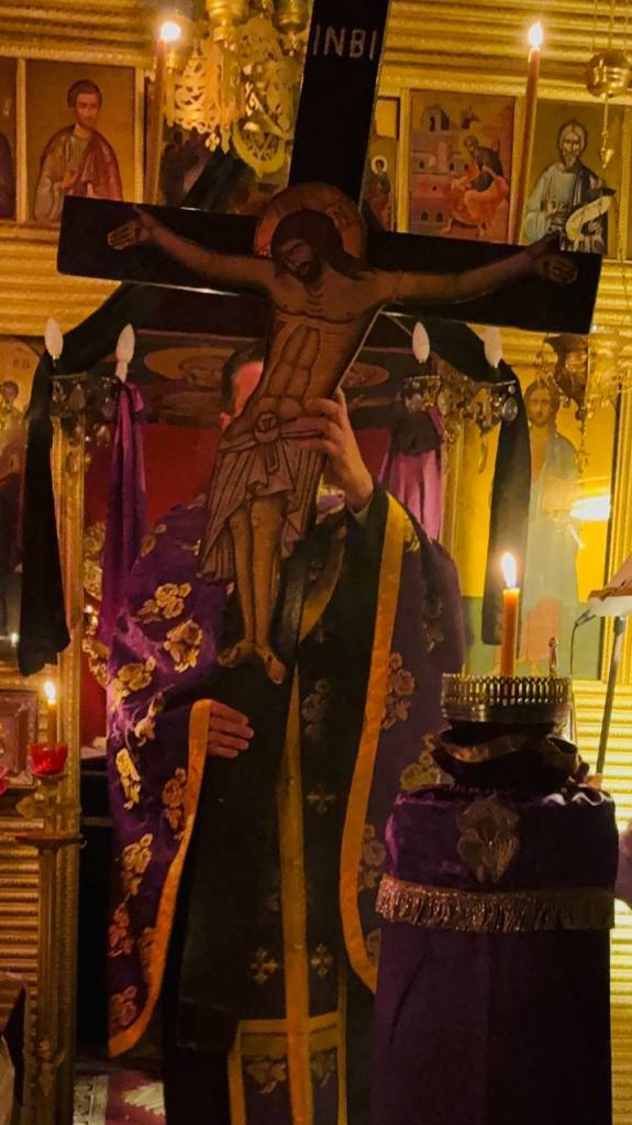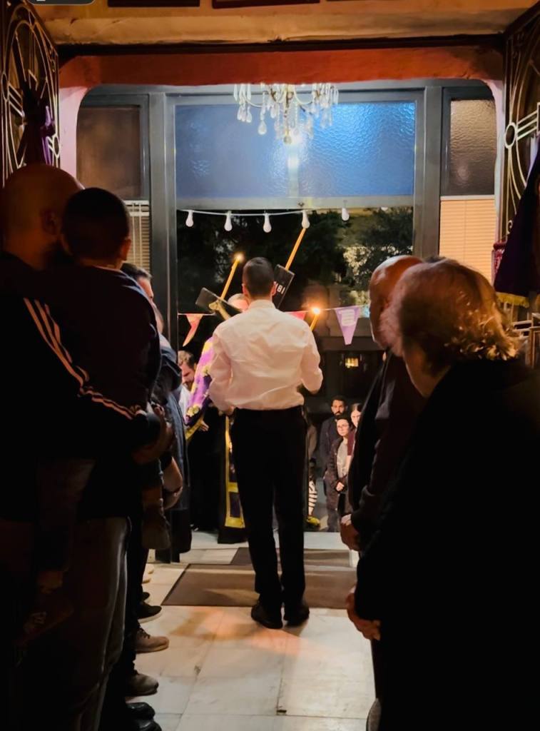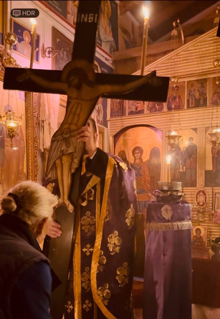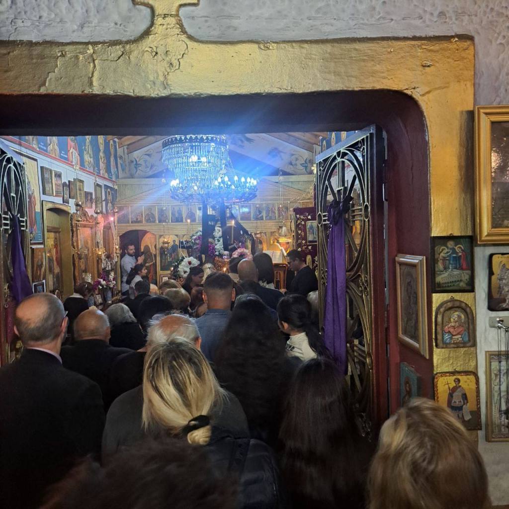 Η ατμόσφαιρα στον ναό είναι ιδιαίτερα επιβλητική. Οι λαμπρές εικόνες έχουν καλυφθεί με μαύρα υφάσματα, οι πολυέλαιοι είναι σβηστοί ή χαμηλωμένοι, και ο φωτισμός είναι λιγοστός, δημιουργώντας ένα περιβάλλον πένθους και περισυλλογής. Οι πιστοί κρατούν αναμμένες λαμπάδες, συμβολίζοντας το φως της πίστης που παραμένει ζωντανό ακόμα και στο σκοτάδι του θανάτου.