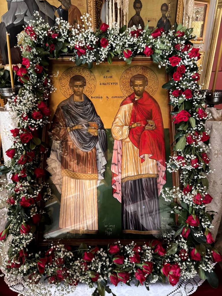 Ἅγιοι Ἀνάργυροι καί θαυματουργοί, ἐπισκέψασθε τάς ἀσθενείας ἡμῶν· δωρεάν ἐλάβετε, δωρεάν δότε ἡμῖν.